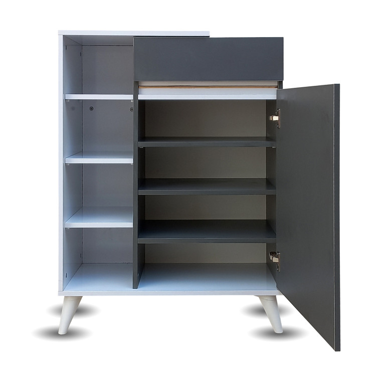جاکفشی الیانا دارای یک درب کمد و یک کشو می باشد و می توان 12 جفت کفش با سایزهای مختلف جای داد. همچنین طبقات قسمت کناری قابلیت دمونتاژ شدن دارد تا برای گذاشتن کفش هایی با پاشنه و ساق بلندتر بتوانید طبقه را برداشته و کفش ها را به راحتی بدون هیچ گونه آسیبی در جاکفشی خود قرار دهید.