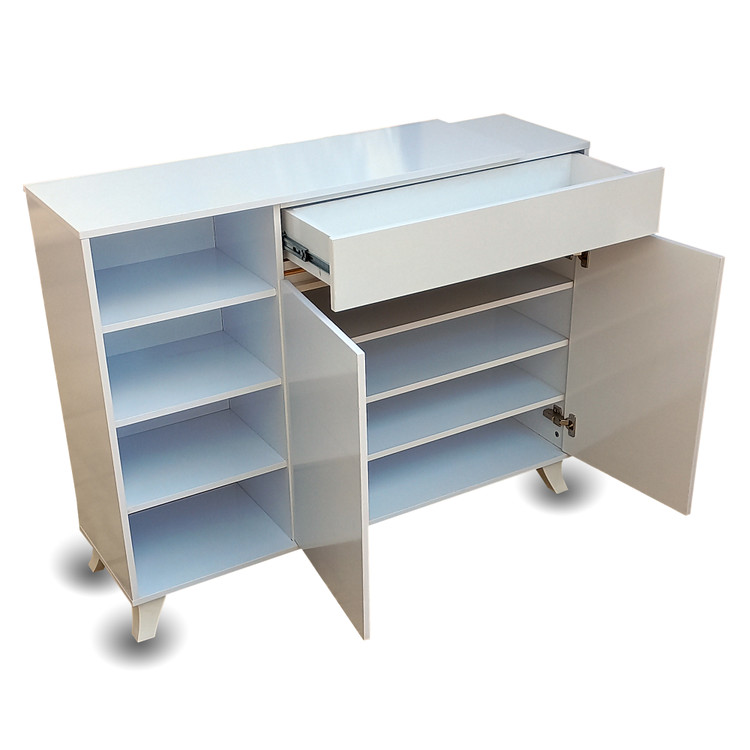خرید جاکفشی مدرن ساده با درب های کلاسیک ساده 4 طبقه با گنجایش تا 20 جفت کفش و جنس درجه یک و ضد خش با دربهای آرام بند خودکار و کشوی جای لوازم برس و واکس میباشد این جاکفشی مدرن دو درب یکی از پر فروش ترین جاکفشی های در حال تولید است که زیبایی و کیفیت این جاکفشی مورد تایید و امتیاز بسیار بالایی از دید خریداران دارد لولای درب این جاکفشی از درب های آرام بند بسیار با کیفیتی استفاده شده که میتواند سالیان سال درب این جاکفشی را حفاظت کند ابعاد طبقات این جاکفشی مدرن استادارد میباشد به طوری که 20 جفت کفش استاندارد سایز بزرگ را به راحتی داخل خود جای میدهد این جاکفشی به علت فروش بالا قیمت تولید بسیار مناسبی دارد و از این رو کالایی با کیفیت و قیمت ارزان آن میتواند نقات قوت این جاکفشی زیبا باشد.