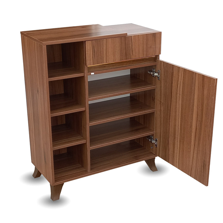 جاکفشی الیانا دارای یک درب کمد و یک کشو می باشد و می توان 12 جفت کفش با سایزهای مختلف جای داد. همچنین طبقات قسمت کناری قابلیت دمونتاژ شدن دارد تا برای گذاشتن کفش هایی با پاشنه و ساق بلندتر بتوانید طبقه را برداشته و کفش ها را به راحتی بدون هیچ گونه آسیبی در جاکفشی خود قرار دهید.